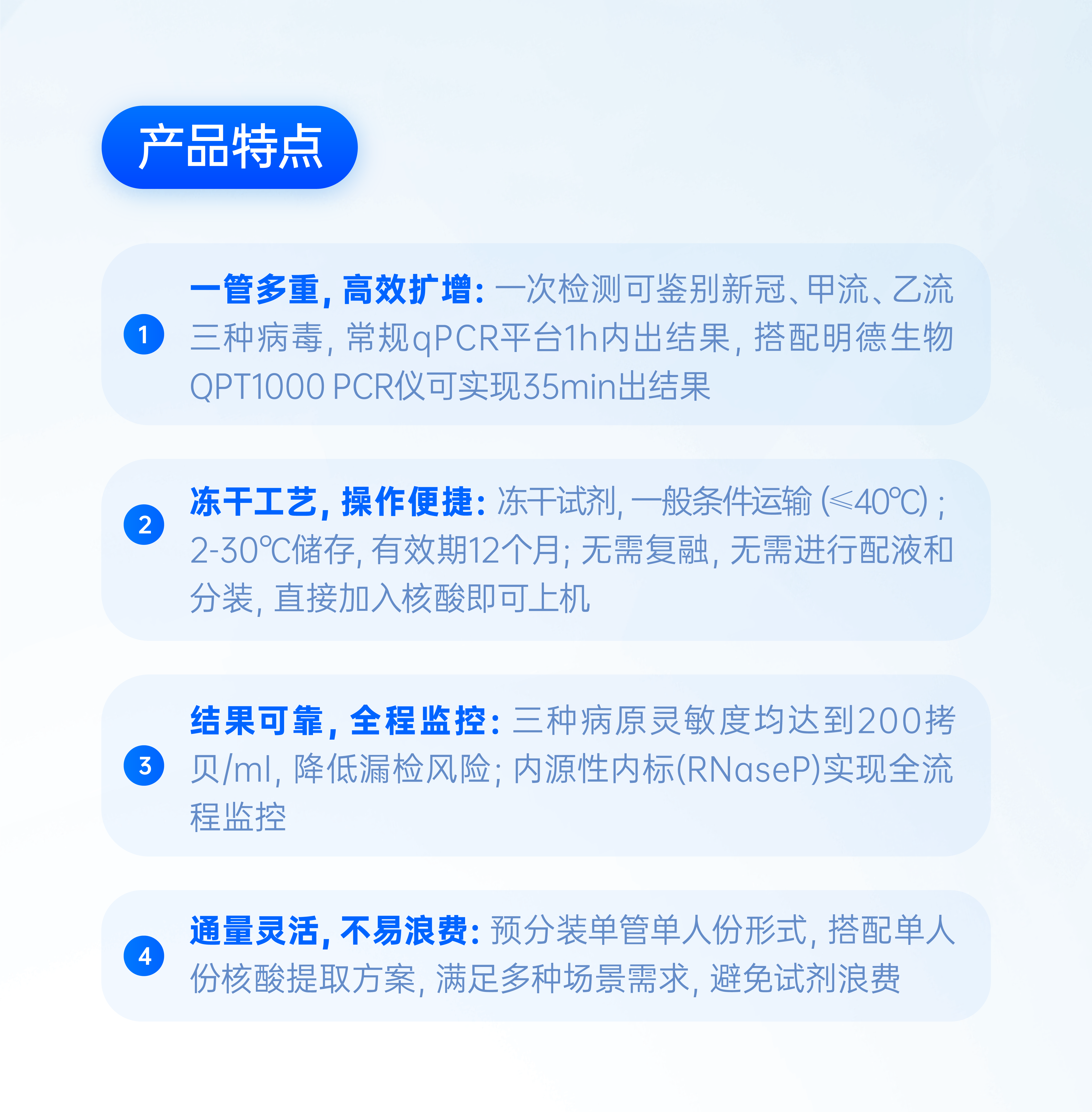 明德生物自主研發(fā)生產(chǎn)的新型冠狀病毒2019-nCoV、甲型流感病毒及乙型流感病毒核酸檢測試劑盒(熒光PCR法),可提升臨床對于新冠及流感病毒的診斷能力,能夠滿足醫(yī)療機構(gòu)急診科、兒科、發(fā)熱門診、檢驗科等不同應(yīng)用場景下相關(guān)呼吸道感染輔助診斷的需求,有效提高病毒檢出率的同時,降低復(fù)診和等待周期,在多種呼吸道病原體流行高發(fā)時節(jié)加快臨床/門診診療效率。