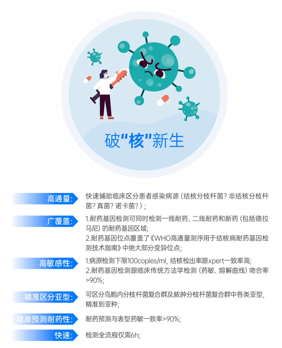 明德生物tNTS靶向高通量測序結(jié)核診斷產(chǎn)品,基于第三代納米孔靶向測序平臺,以及明德獨(dú)特專利設(shè)計(jì)的病原體及耐藥基因特異性引物,配以多重PCR反應(yīng)體系進(jìn)行靶區(qū)域的多重?cái)U(kuò)增富集,實(shí)現(xiàn)在6小時(shí)內(nèi)完成感染病原體和耐藥基因的快速、精準(zhǔn)檢測,輔助臨床用于區(qū)分患者感染結(jié)核分枝桿菌、非結(jié)核分枝桿、真菌、諾卡菌等病原體,對于結(jié)核患者尤其是多重耐藥結(jié)核患者及時(shí)發(fā)現(xiàn)和盡早有效治療提供更便利的技術(shù)支撐,也為推進(jìn)2030終止結(jié)核帶來有效解決方案!