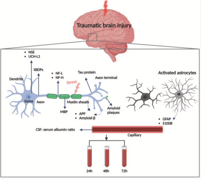 創(chuàng)傷性腦損傷(Traumatic Brain Injury, TBI)后,中樞神經(jīng)系統(tǒng)細(xì)胞損傷及生物標(biāo)志物釋放的機(jī)制