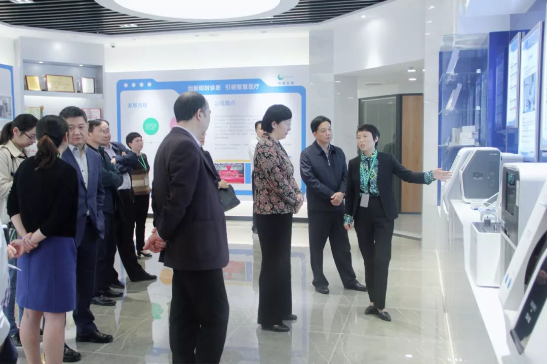焦紅局長一行在陳莉莉董事長的陪同下參觀了明德產品展示廳。在觀看了企業(yè)宣傳片后,陳莉莉博士向焦紅局長匯報了POCT、化學發(fā)光、血氣分析、胸痛中心、分子診斷等產品及服務的研發(fā)創(chuàng)新、市場應用、產品規(guī)劃情況。焦紅局長仔細詢問了每個產品的應用場景,對明德生物的研發(fā)創(chuàng)新、產品規(guī)劃及應用價值表示了肯定。