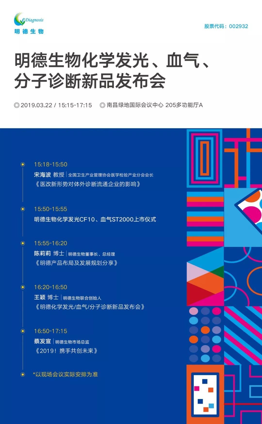 更值得期待的是,3月22日下午15:15-17:15,明德生物將在南昌國(guó)際博覽城綠地鉑瑞酒店會(huì)議中心 205多功能廳A舉行新產(chǎn)品發(fā)布會(huì),發(fā)布POCT化學(xué)發(fā)光、血?dú)夥治、分子診斷等多款新品。