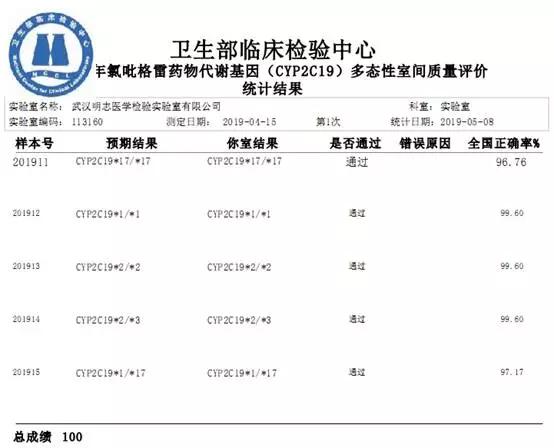明德生物控股子公司武漢明志醫(yī)學(xué)檢驗(yàn)實(shí)驗(yàn)室有限公司參加衛(wèi)生部臨檢中心EGFR、腫瘤游離DNAEGFR、ALK、KRAS、氯吡格雷藥物代謝基因(CYP2C19)、人乳頭瘤病毒(HPV)分型共6個(gè)項(xiàng)目第一次室間質(zhì)量評價(jià)結(jié)果全部滿分通過,再次驗(yàn)證了明志醫(yī)學(xué)檢驗(yàn)室實(shí)驗(yàn)的檢測流程規(guī)范,判讀準(zhǔn)確。