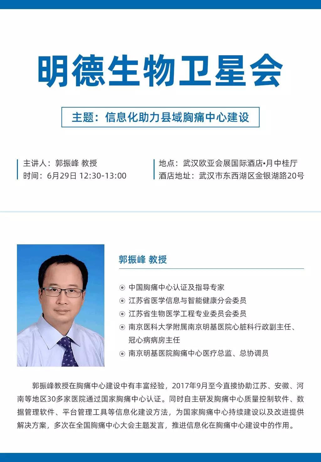 作為國內(nèi)首家提出胸痛中心一體化建設(shè)解決方案的IVD國家高新技術(shù)企業(yè),明德生物將在大會舉辦期間召開胸痛中心專題衛(wèi)星會。特別邀請中國胸痛中心認證及指導(dǎo)專家、南京醫(yī)科大學(xué)附屬南京明基醫(yī)院冠心病病房主任、胸痛中心醫(yī)療總監(jiān)、總協(xié)調(diào)員郭振峰教授就《信息化助力縣域胸痛中心建設(shè)》主題作精彩分享,會議由胸痛中心武漢認證辦公室主任張勇教授主持。