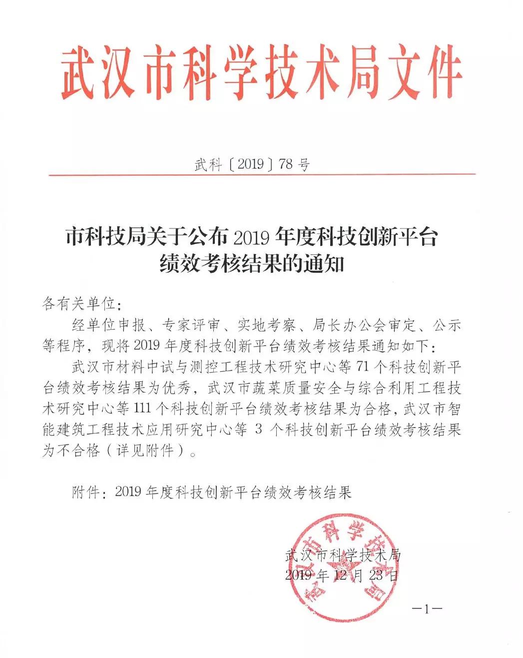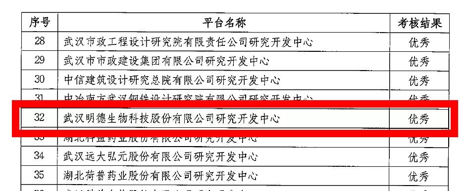 2019年12月23日,武漢市科學技術(shù)局發(fā)布了《市科技局關(guān)于公布2019年度科技創(chuàng)新平臺績效考核結(jié)果的通知》,武漢明德生物科技股份有限公司研究開發(fā)中心考核結(jié)果為優(yōu)秀!