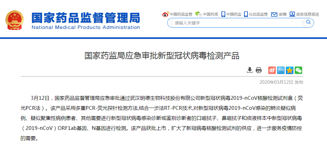 3月12日,國(guó)家藥品監(jiān)督管理局應(yīng)急審批通過武漢明德生物科技股份有限公司新型冠狀病毒2019-nCoV核酸檢測(cè)試劑盒(熒光PCR法)。