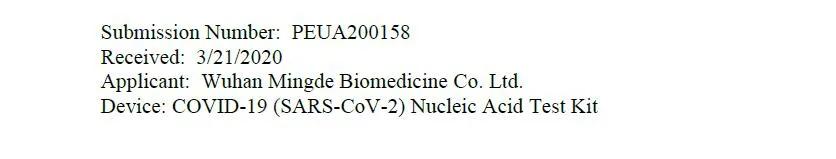 美國FDA于2020年3月21日回函明德生物新冠病毒核酸檢測試劑COVID-19(SARS-CoV-2) Nucleic Acid Test Kit緊急使用申請,并下發(fā)受理號,試劑正式進(jìn)入審核階段,已獲在美緊急情況下銷售權(quán)利。