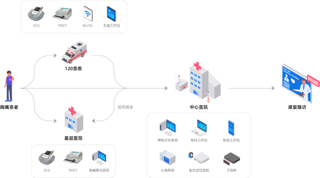 明德生物急危重癥平臺為醫(yī)院提供胸痛,卒中中心建設一站式服務,實現(xiàn)急診院前、院中、院后多業(yè)務全流程的閉環(huán)可追溯管理。