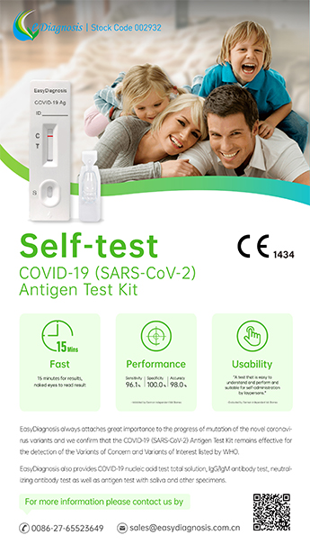 明德生物新冠病毒抗原自測試劑盒,具有快速、便捷、使用場景廣泛等特點,15分鐘快速獲取結果。經(jīng)德國獨立實驗室Biomex評估,產(chǎn)品靈敏度96.1%,特異性100%,準確性98%;針對CT值小于30的樣本,靈敏度達98.8%,方便個人及家庭對新冠病毒的自主檢測。此外,目前已被WHO列為Concern和Interest的8種變異毒株,不影響檢測結果。