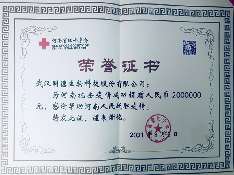 8月5日,明德生物向河南省紅十字會(huì)捐贈(zèng)價(jià)值1100多萬元防疫物資和200萬元人民幣,支援河南抗災(zāi)防疫。河南省紅十字會(huì)黨組書記、專職副會(huì)長萬英,河南省紅十字會(huì)黨組成員、秘書長劉瑞勇,河南省紅十字會(huì)組織宣傳部部長梁宗飛,河南省疾病預(yù)防控制中心紀(jì)委書記劉翠華,河南省疾病預(yù)防控制中心藥械處處長心崔衛(wèi)國,河南省疾病預(yù)防控制中心財(cái)務(wù)處處長常紅參加捐贈(zèng)儀式并接收捐贈(zèng)物資與捐款。
